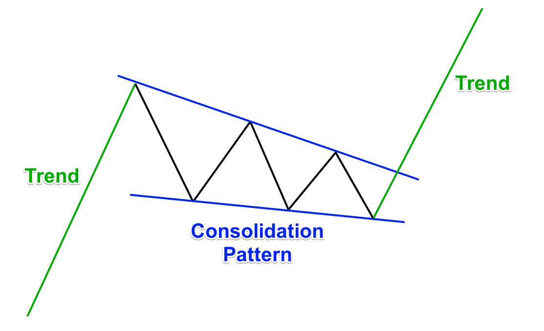 Упрощённое изображение того, как может выглядеть паттерн технического анализа на графике. В приведённом выше примере мы видим тренд, который превращается в консолидацию, а затем снова возобновляется.