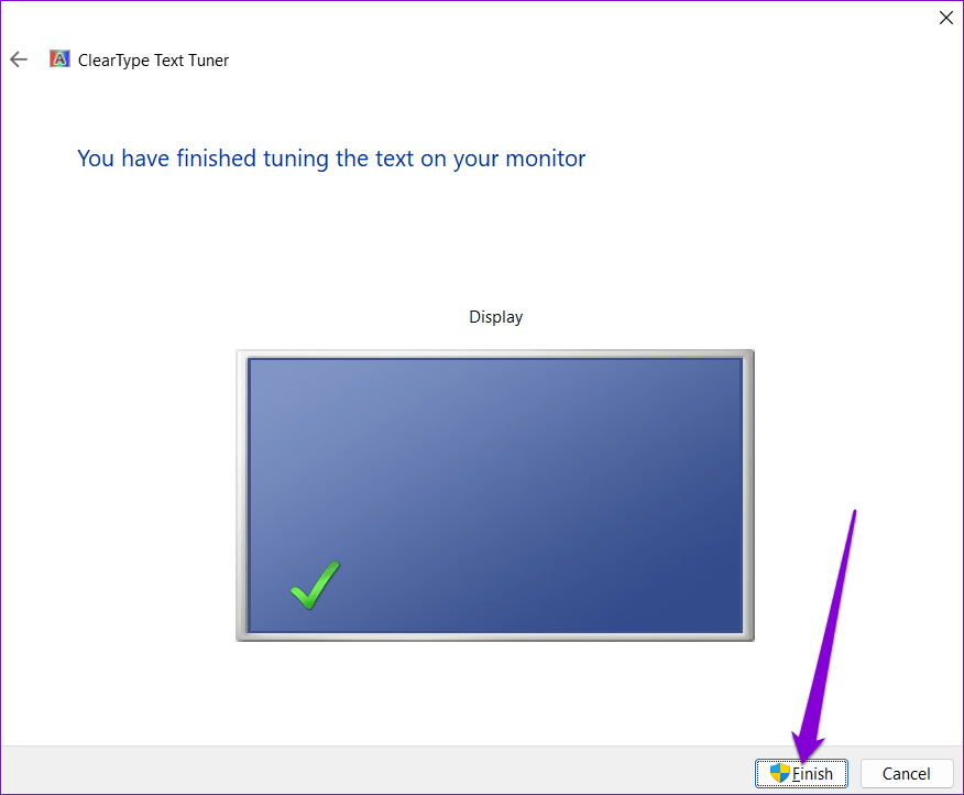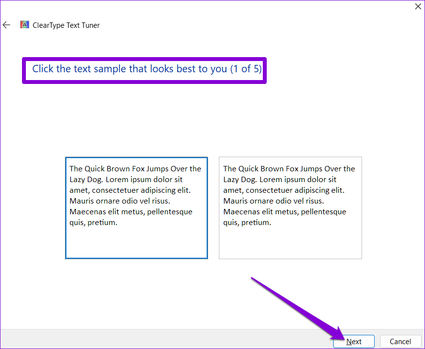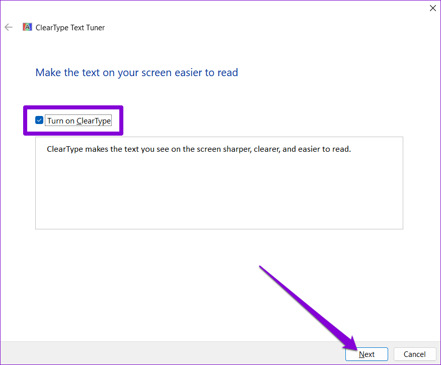 Шаг 2: Установите флажок рядом с «Включить ClearType» и нажмите «Далее».