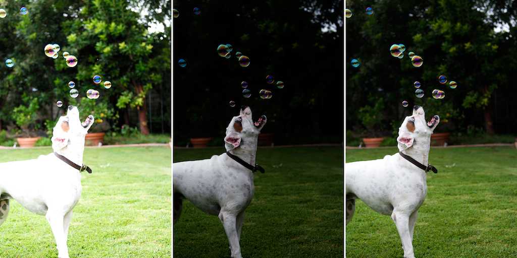 Слева направо — переэкпонированный снимок, недоэкспонированный и правильно экспонированный