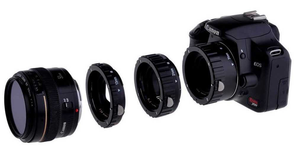 - Набор удлинительных колец. Их работа аналогично работе мехов, однако изменять масштаб изображения в этом случае возможно лишь ступенчато. Преимущества: не ухудшается качество изображения, автоматические функции камеры продолжают работать. Минусы: уменьшается светосила объектива, для изменения масштаба приходится снимать объектив, высокая стоимость;