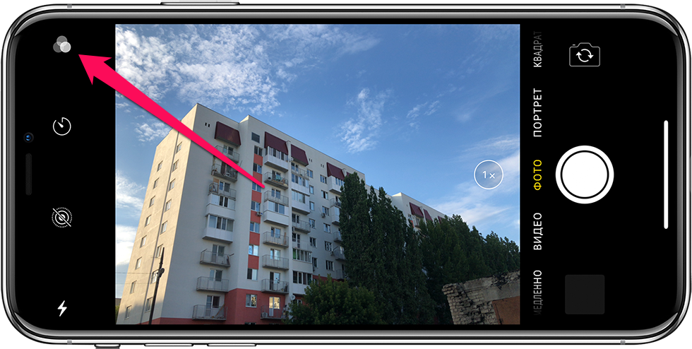 Шаг 2. Нажмите на иконку с тремя перекрещивающимися кругами, расположенную в углу. Она открывает список доступных для съемки предустановленных эффектов, среди которых черно-белый режим. Эффекты можно применять в большинстве режимах съемки, в том числе в портретном (как снимать правильно).