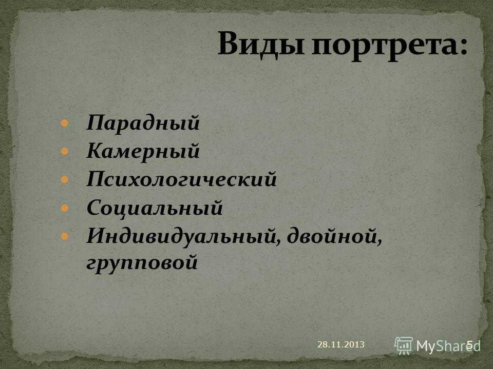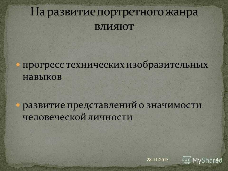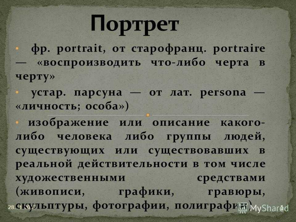 Презентация на тему: » 28.11.2013 1 фр. portrait, от старофранц. portraire «воспроизводить что-либо черта в черту» устар. парсуна от лат. persona «личность; особа») изображение.» — Транскрипт: