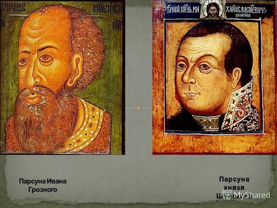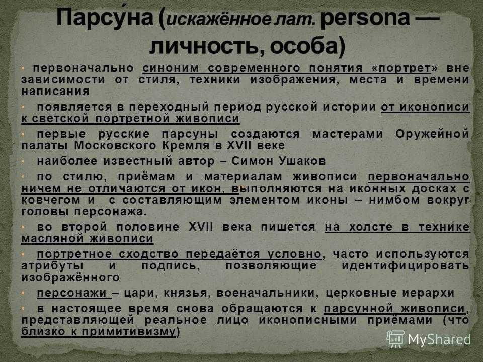 первоначально синоним современного понятия «портрет» вне зависимости от стиля, техники изображения, места и времени написания появляется в переходный период русской истории от иконописи к светской портретной живописи первые русские парсуны создаются мастерами Оружейной палаты Московского Кремля в XVII веке наиболее известный автор – Симон Ушаков по стилю, приёмам и материалам живописи первоначально ничем не отличаются от икон, выполняются на иконных досках с ковчегом и с составляющим элементом иконы – нимбом вокруг головы персонажа. во второй половине XVII века пишется на холсте в технике масляной живописи портретное сходство передаётся условно, часто используются атрибуты и подпись, позволяющие идентифицировать изображённого персонажи – цари, князья, военачальники, церковные иерархи в настоящее время снова обращаются к парсунной живописи, представляющей реальное лицо иконописными приёмами (что близко к примитивизму)