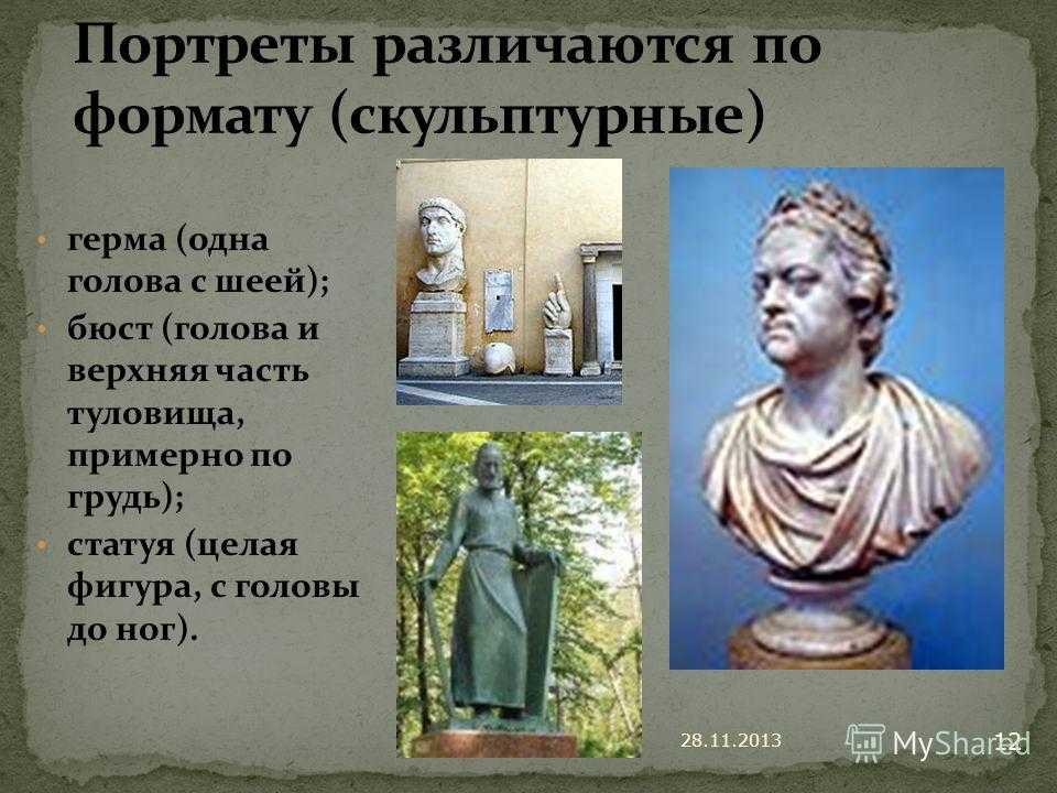герма (одна голова с шеей); бюст (голова и верхняя часть туловища, примерно по грудь); статуя (целая фигура, с головы до ног)