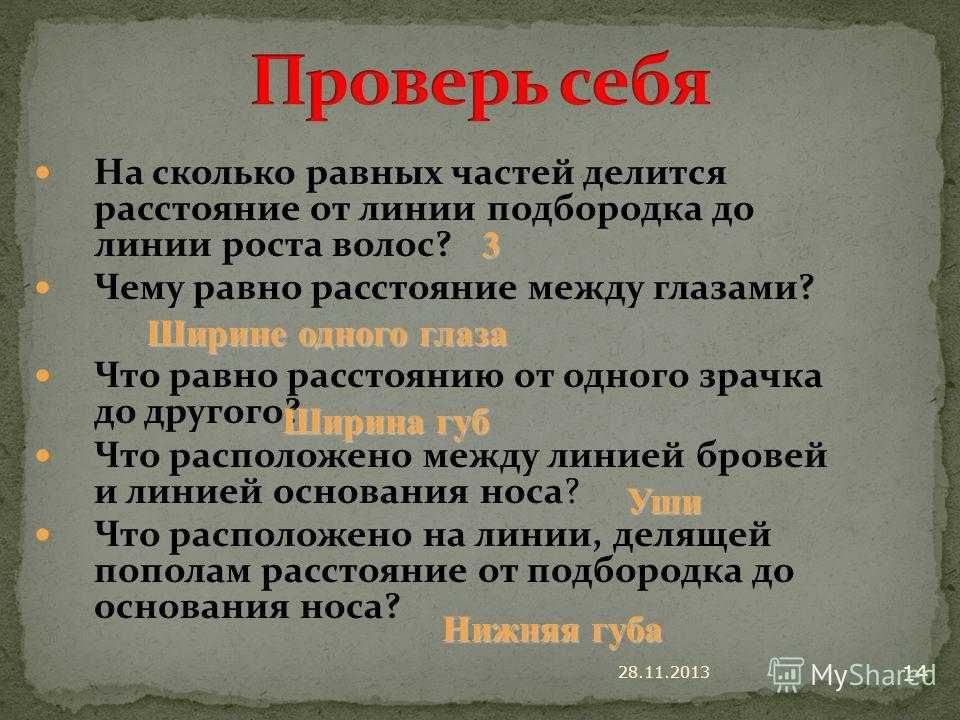 На сколько равных частей делится расстояние от линии подбородка до линии роста волос? Чему равно расстояние между глазами? Что равно расстоянию от одного зрачка до другого? Что расположено между линией бровей и линией основания носа? Что расположено на линии, делящей пополам расстояние от подбородка до основания носа? Ширине одного глаза Ширина губ Уши Нижняя губа