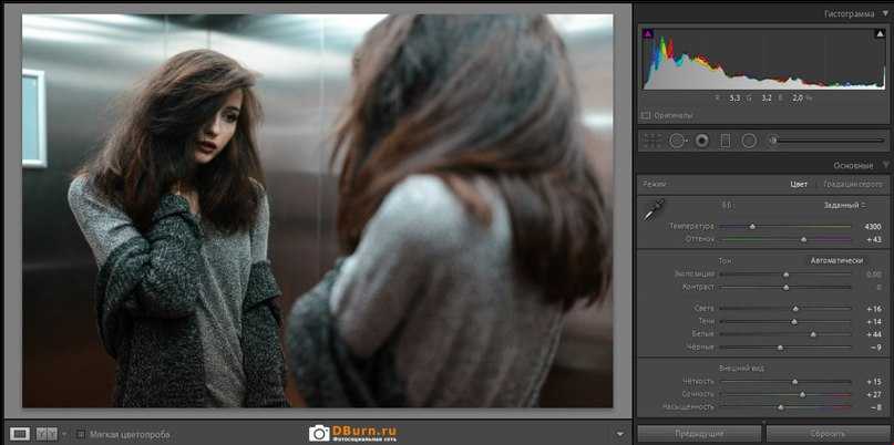 Гистограмма помогает увидеть недостаток контраста на графике. Если график не примыкает к левому краю, значит черного цвета на снимке нет вовсе. Подкорректируйте гистограмму так, чтобы её левый край примыкал к крайней грани, но не пересекал её, иначе появятся провалы в тенях. Это можно проделать увеличением общего контраста, уровнями или кривыми. Также доступны инструменты для местного редактирования, такие как затемнение тонов (света, средние, тени) и кисть в различных режимах наложения.