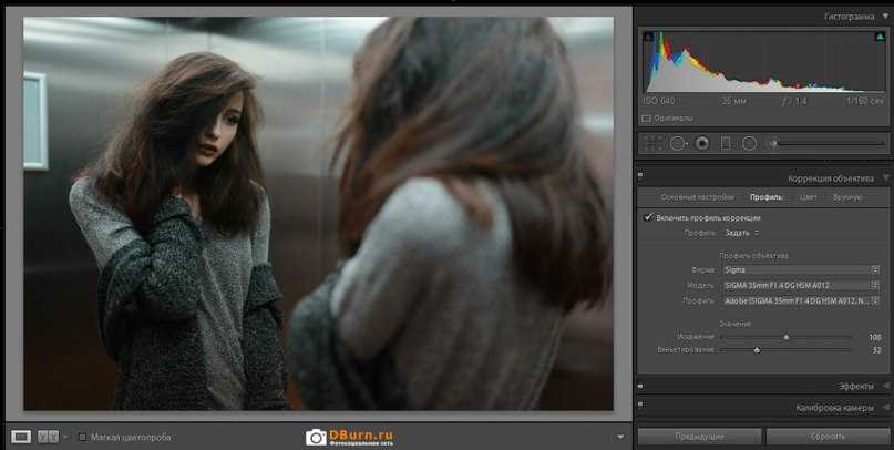 Первым делом я всегда перехожу во вкладку Калибровка Камеры. Сразу же меняю профиль AdobeStandart на CameraStandart. Ну и немного поигрался с ползунками. А также захожу во вкладку Коррекция Объектива и включаю профиль коррекции объектива. К тому же добавляю виньетирование, чтобы края на фото были не слишком светлые.