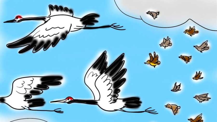 И возвращаются скворцы. — скрещивают руки, развернув ладони к себе, большие пальцы переплетают, а остальными начинают взмахивать.