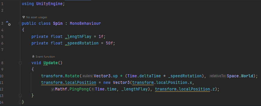Теперь, когда мы разобрались с инструментами, приступим к созданию простой анимации 3D-модели в Unity. К примеру, у нас в игре есть собираемый объект, и мы хотим, чтобы он вращался. Мы можем сделать эту анимацию двумя вариантами — через Animation или через код. Посмотрим, как ее реализовать через Animation.