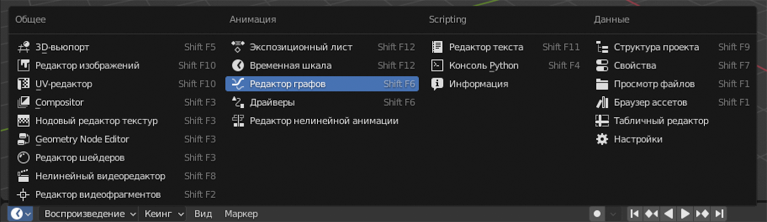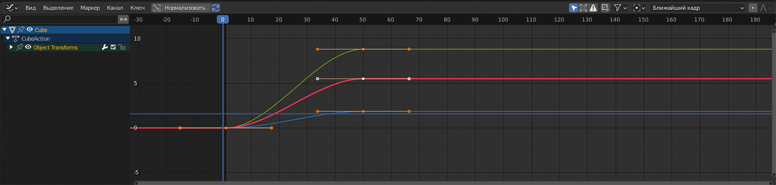 Редактор графов похож на таймлайн, но в нём отображена более детальная информация о ключевых кадрах и том, как они интерполированы — то есть как кривая отображается на графике.