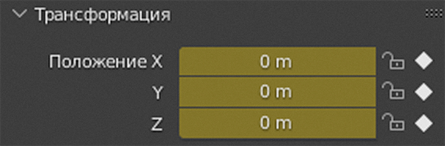Меню вставки ключевых кадров необязательно вызывать во вьюпорте. Можно навести курсор на нужный параметр во вкладке Трансформация (Transform), при необходимости изменить значение и нажать I. Параметр станет жёлтым, оповещая, что изменения зафиксировались в ключевом кадре.