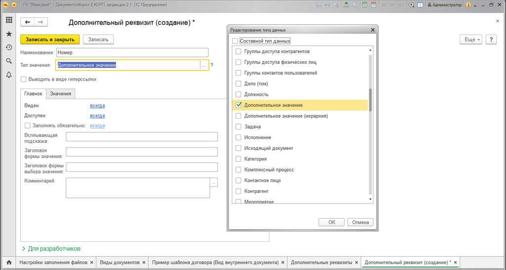 Если создать новый реквизит, то вам потребуется указать наименование и задать тип значения. Для этого пишем «Дополнительное значение», и задаем список на закладке «Значение».