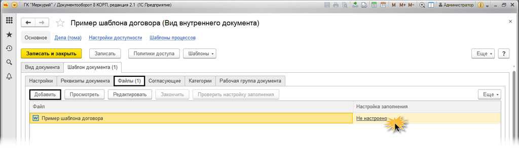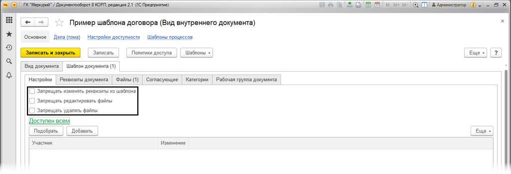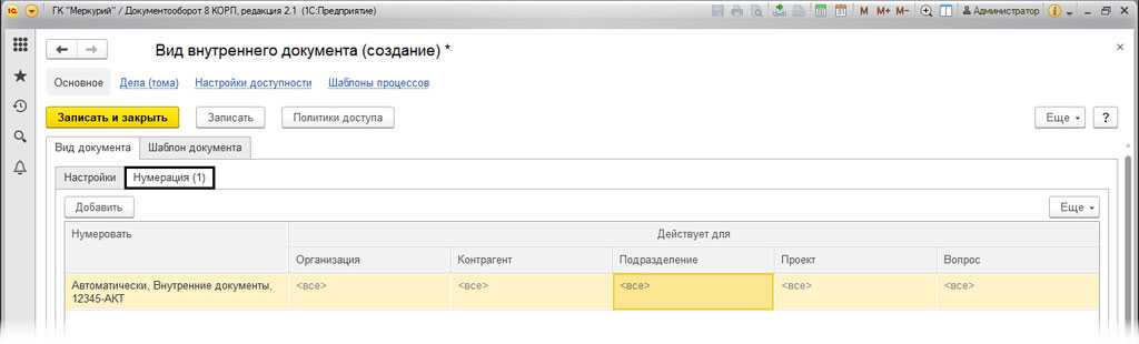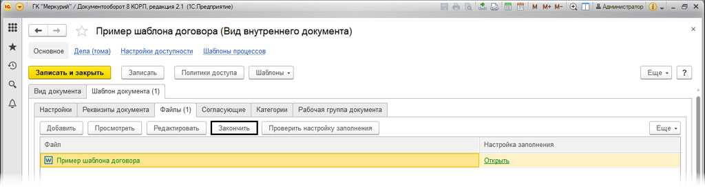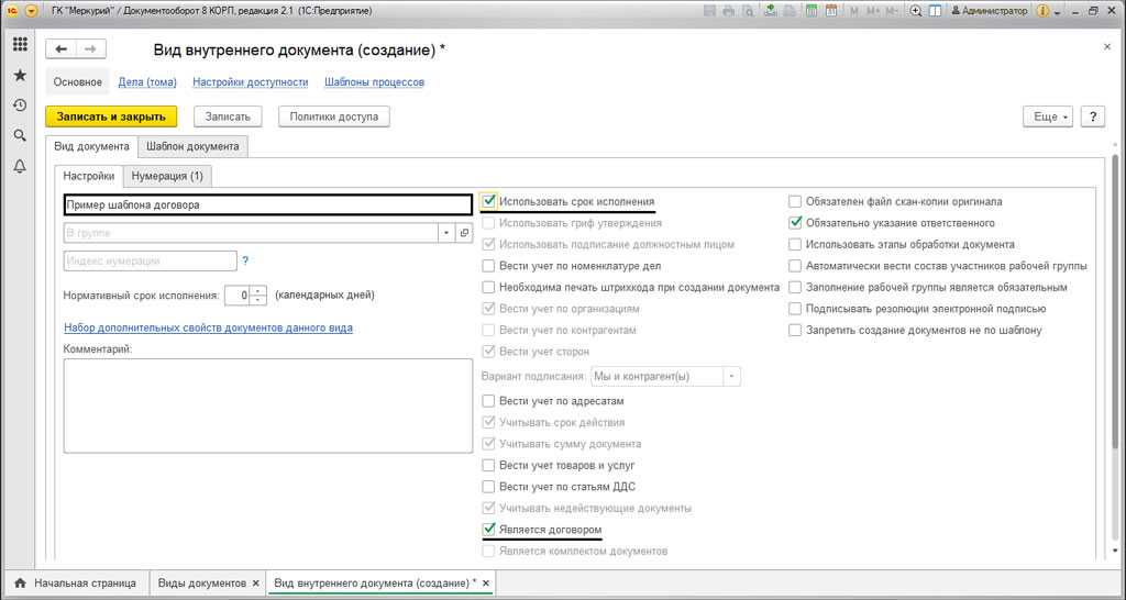 Называем его, например, «Пример шаблона договора» и в настройках ставим галочки на «Использовать срок исполнения «, после на «Является договором». Если необходимо включить документ в нужную группу, то вам потребуется задать индекс нумератора. Так называемый суффикс либо префикс документа.