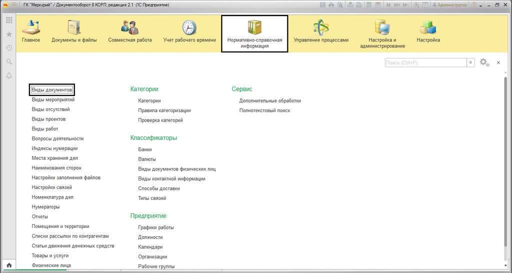 Для создания шаблона, нужно создать новый вид документа. Он будет заполнять наш шаблон. Для этого открываем раздел «Нормативно-справочная информация»-«Виды документов».