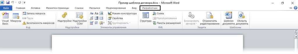 После чего в меню появятся несколько вкладок под именем «Разработчик».