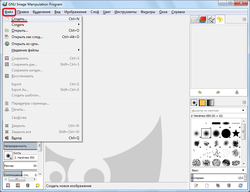Для того, чтобы создать изображение с прозрачным фоном, прежде всего, открываем в верхнем меню раздел «Файл», и выбираем пункт «Создать».