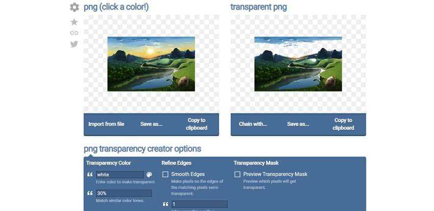 Это простой в использовании инструмент на основе браузера, который не требует установки программы и позволяет иметь изображения PNG с прозрачным фоном. Интерфейс прост, вам нужно только добавить локальный PNG-файл, и фон будет автоматически конвертирован в прозрачный. Вы можете скопировать обработанное изображение в буфер обмена или сохранить его в локальной системе. Кроме того, вы можете установить цвет прозрачности, процентное соотношение, чтобы подобрать похожие цветовые тона, выделить края, а также выбрать маску прозрачности.