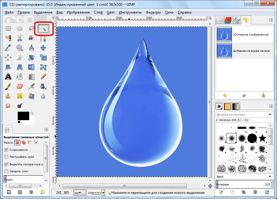 Далее применяем инструмент, который носит название «Выделение смежных областей», хотя большинство пользователей из-за характерной иконки называют его «волшебной палочкой». «Волшебная палочка» расположена на панели инструментов в левой части программы. Кликаем по логотипу этого инструмента.