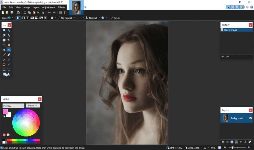 Paint.NET – это золотая середина, если профессиональный софт вас пугает, а стандартный редактор изображений windows Paint для вас не подходит. Этот простейший в управлении фоторедактор полностью переведен на русский язык и позволяет обрабатывать популярные форматы графики: png, gif, jpeg, bmp, tiff, tga, dds, pdn. В программе можно отсканировать фото с подключенного устройства или сразу обработать. Можно провести все базовые редактирования: поворот, обрезка, цветокоррекция. Профессионального результата в этом софте добиться нельзя, но зато он полностью бесплатный и не нагружает системный процессор.