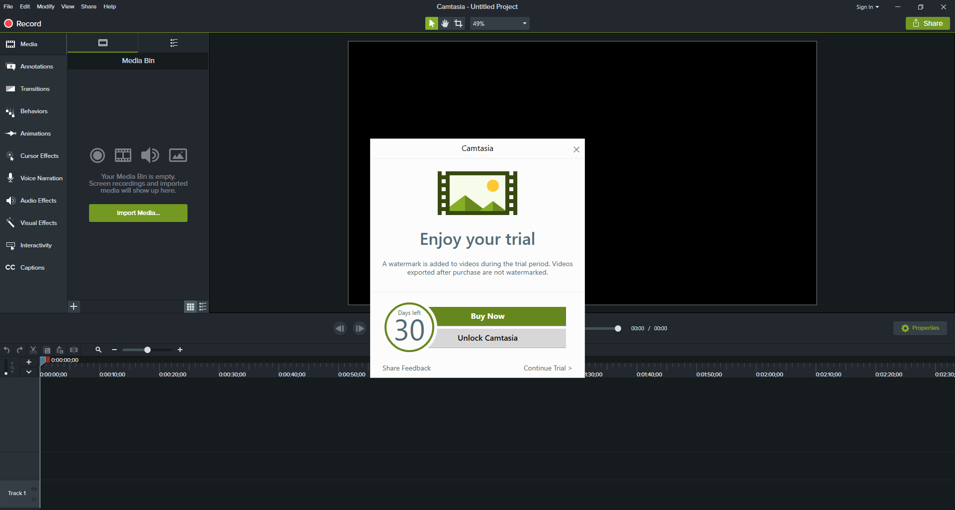 Поверх главного окна всплывёт предложение приобрести полную версию программы или продолжать работать в пробном режиме. Вас предупреждают, что видео, созданные до покупки программы, будут иметь неудаляемые «водяные знаки». Выбираем последний пункт.