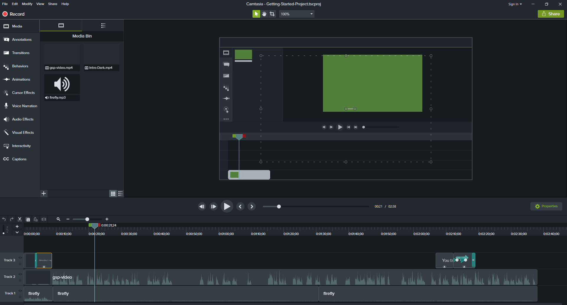 По умолчанию загружается самопрезентация – проект, где представлены основы работы с Camtasia. Видео длится две с половиной минуты. Оно озвучено на английском языке, но вам важнее увидеть, что показывают на экране.