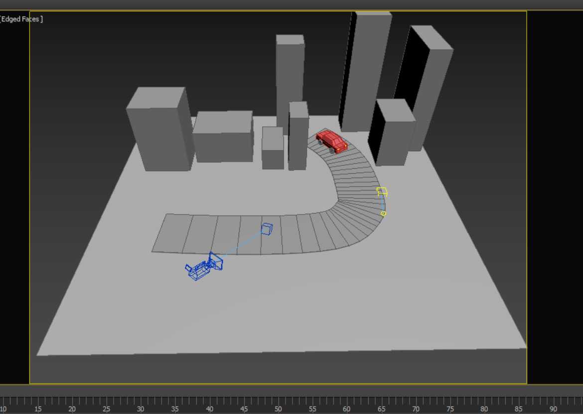 В сцене заранее установлен источник света (CoronaSun) и камера (Phisical Camera) в месте съемки. Также машина установлена в начале дороги, по которой она поедет. Перед началом анимации, нужно подготовить объекты сцены.