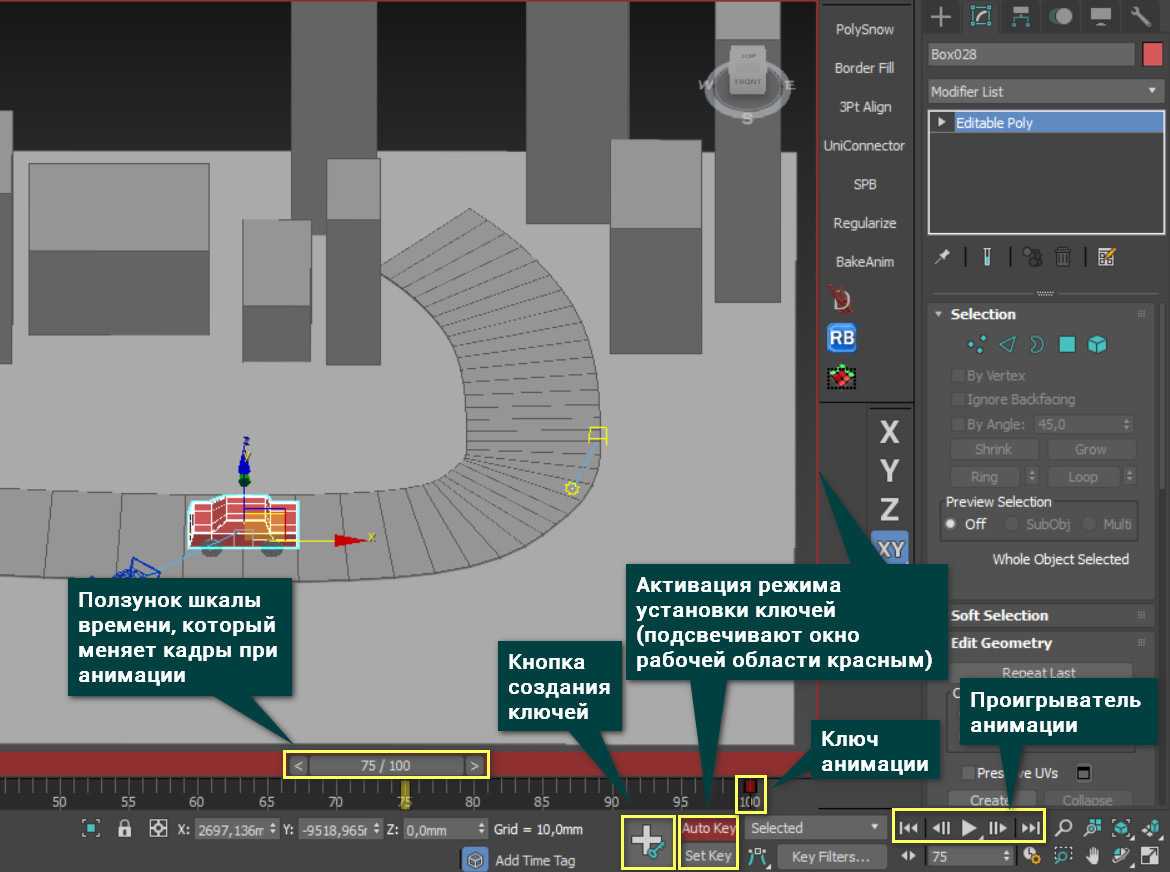Анимация состоит из кадров, на которых находятся ключи. Ключи несут в себе информацию о положении объекта в конкретный момент времени. Для того, чтобы включить режим установки ключей, нужно нажать Auto Key или Set Key. Auto Key может автоматически устанавливать ключ на кадре, если объект изменит положение. Затем обязательно нужно выбрать объект, который анимируется. Здесь это машина. Далее необходимо: