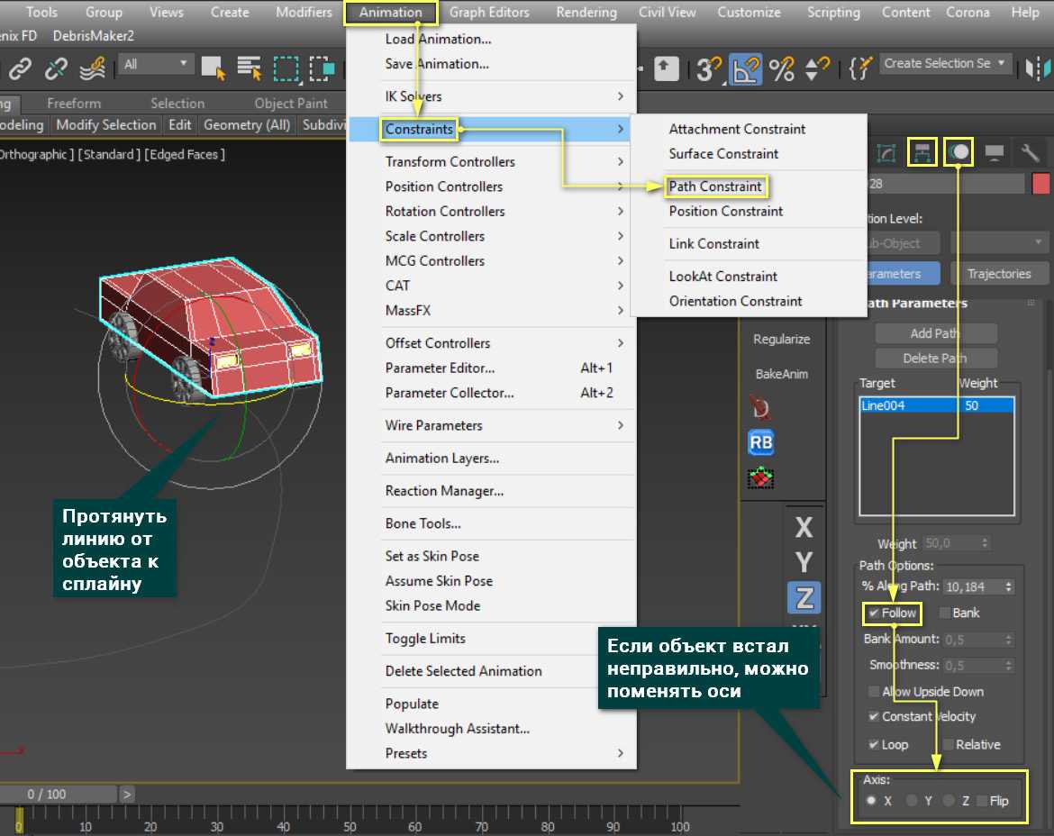 3) Выбрать объект (машина) и воспользоваться Animation – Constraints – Path Constraint. Протянуть образовавшуюся линию к сплайну (Line) и отпустить. После отжатия ЛКМ справа откроется меню Motion, в котором нужно будет начать галочку Follow. Если объект неправильно встал на линию, то его положение можно изменить в разделе Axis. Также можно попробовать изменить положение опорной точки (Pivot) в разделе Hierarchy. На этом подготовка данной сцены окончена.