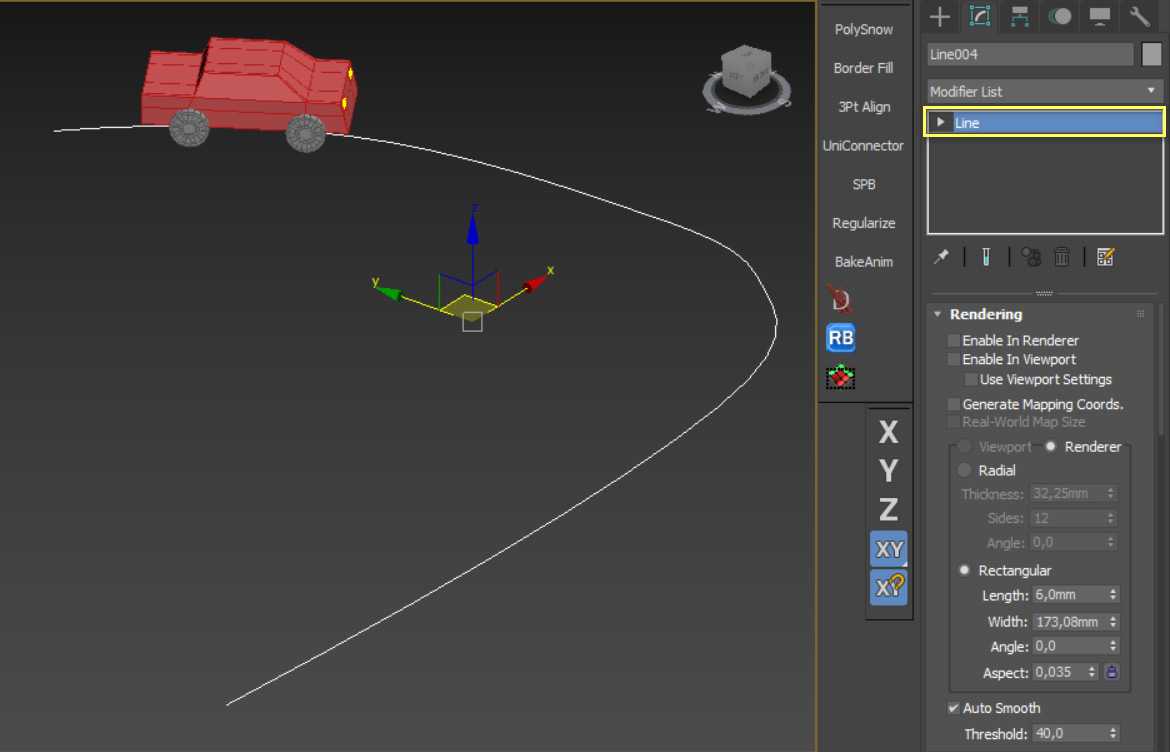 2) Создать путь движения с помощью Line. В статье сплайн объемный, но включать такое отображение не обязательно.