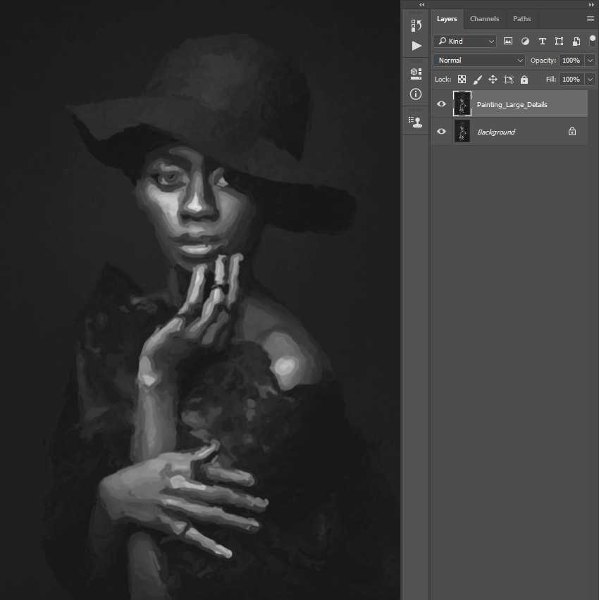Жмем Ctrl+Alt+Shift+E, чтобы создать отдельную копию всех видимых слоев. Затем Ctrl+Shift+U, чтобы обесцветить получившийся слой.