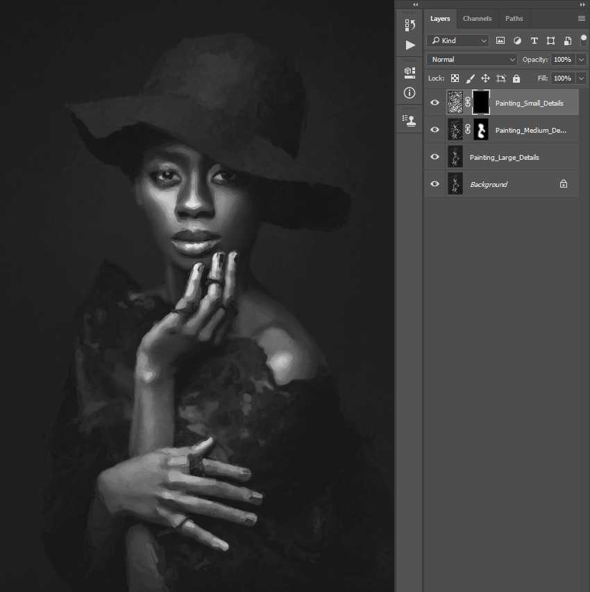 Также во время работы корректируйте диаметр кисточки, чтобы более тщательно проработать мелкие детали. Для быстрого изменения размера воспользуйтесь клавишами .