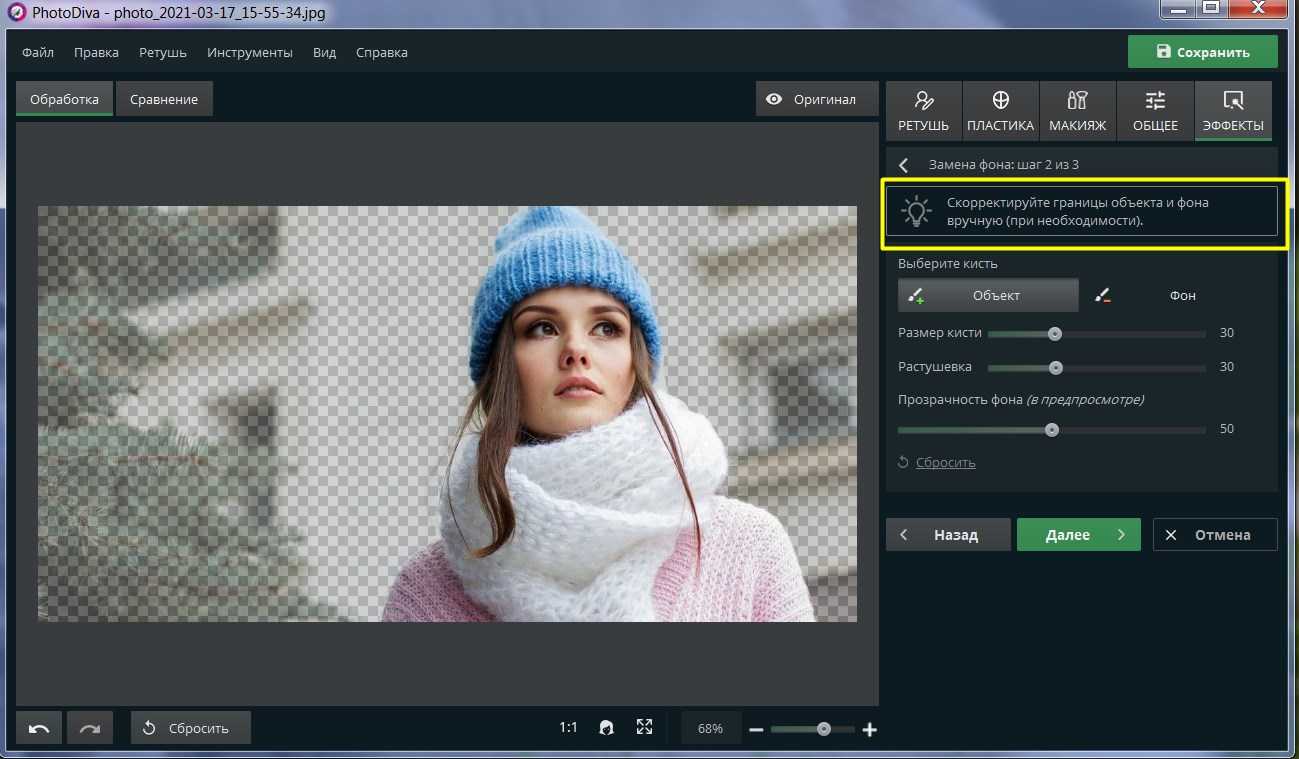 Чтобы отделить объект от фона, возьмите зеленую кисть и обведите контур фигуры, которую хотите оставить. Красной кистью отметьте участки, которые надо удалить. Они станут полупрозрачными и при нажатии на кнопку «Далее» будут вырезаны программой.
