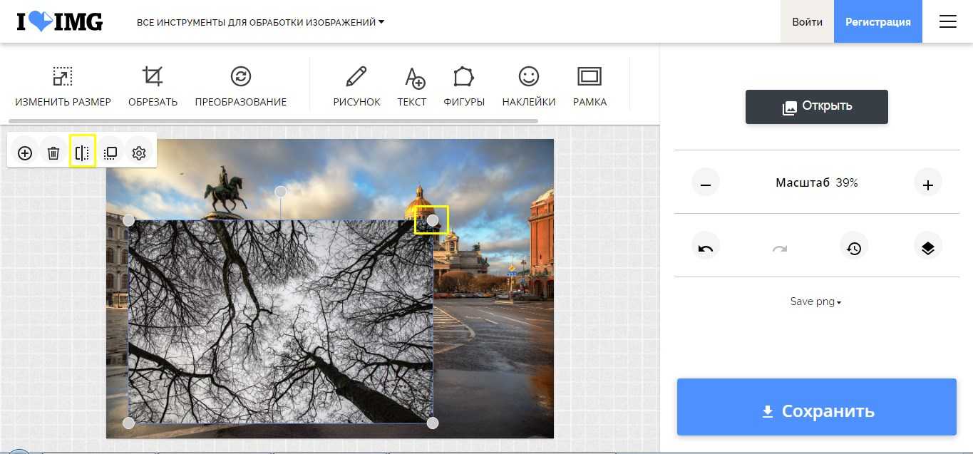 Меняйте размер или поворачивайте картинку при помощи точек. Отразить ее по горизонтали можно задействовав иконку с левой стороны рабочего окна.