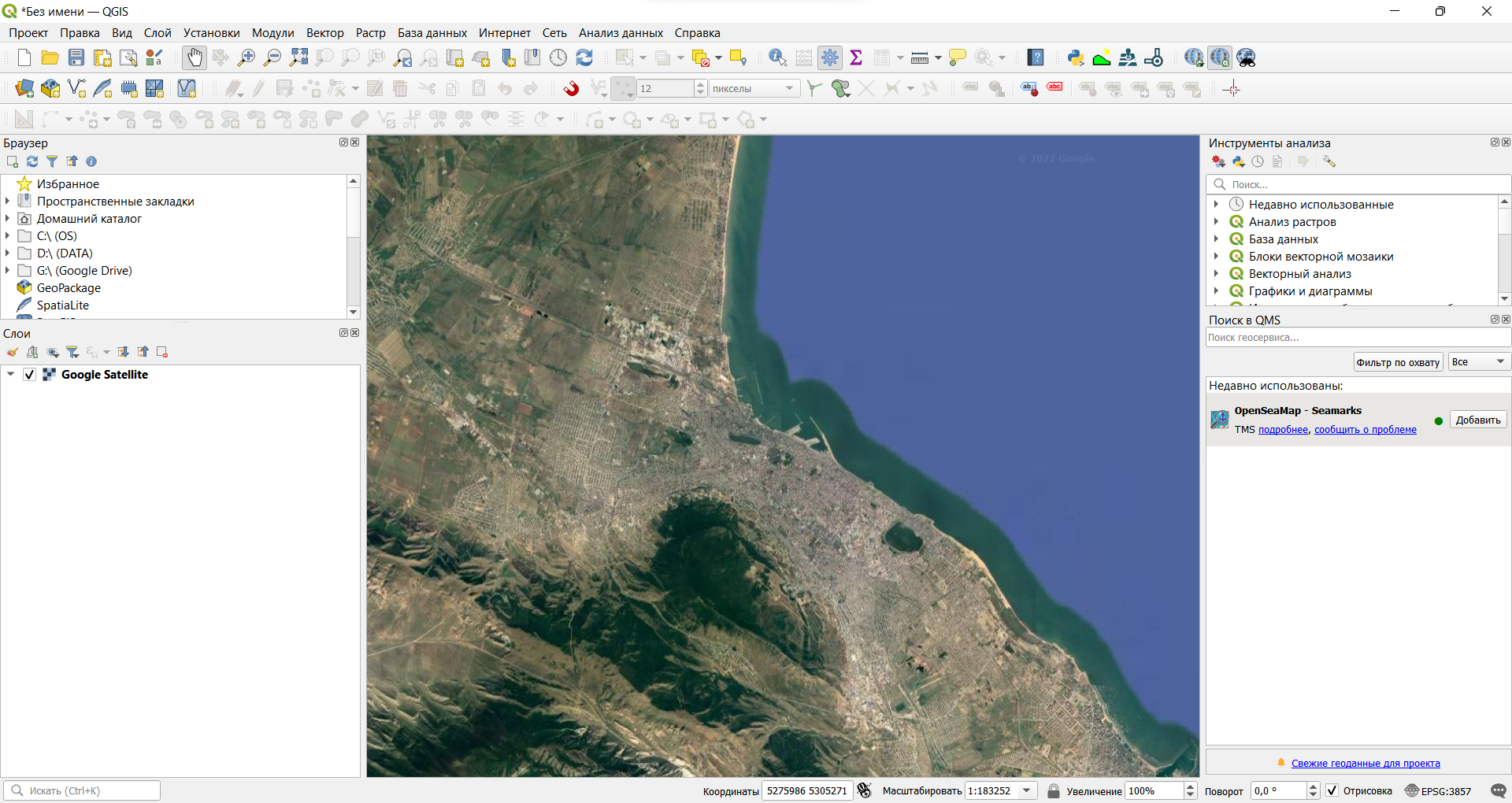 Создайте новый проект QGIS и добавьте к нему в качестве базовой карты любое покрытие космических снимков (например, Google Satellite).