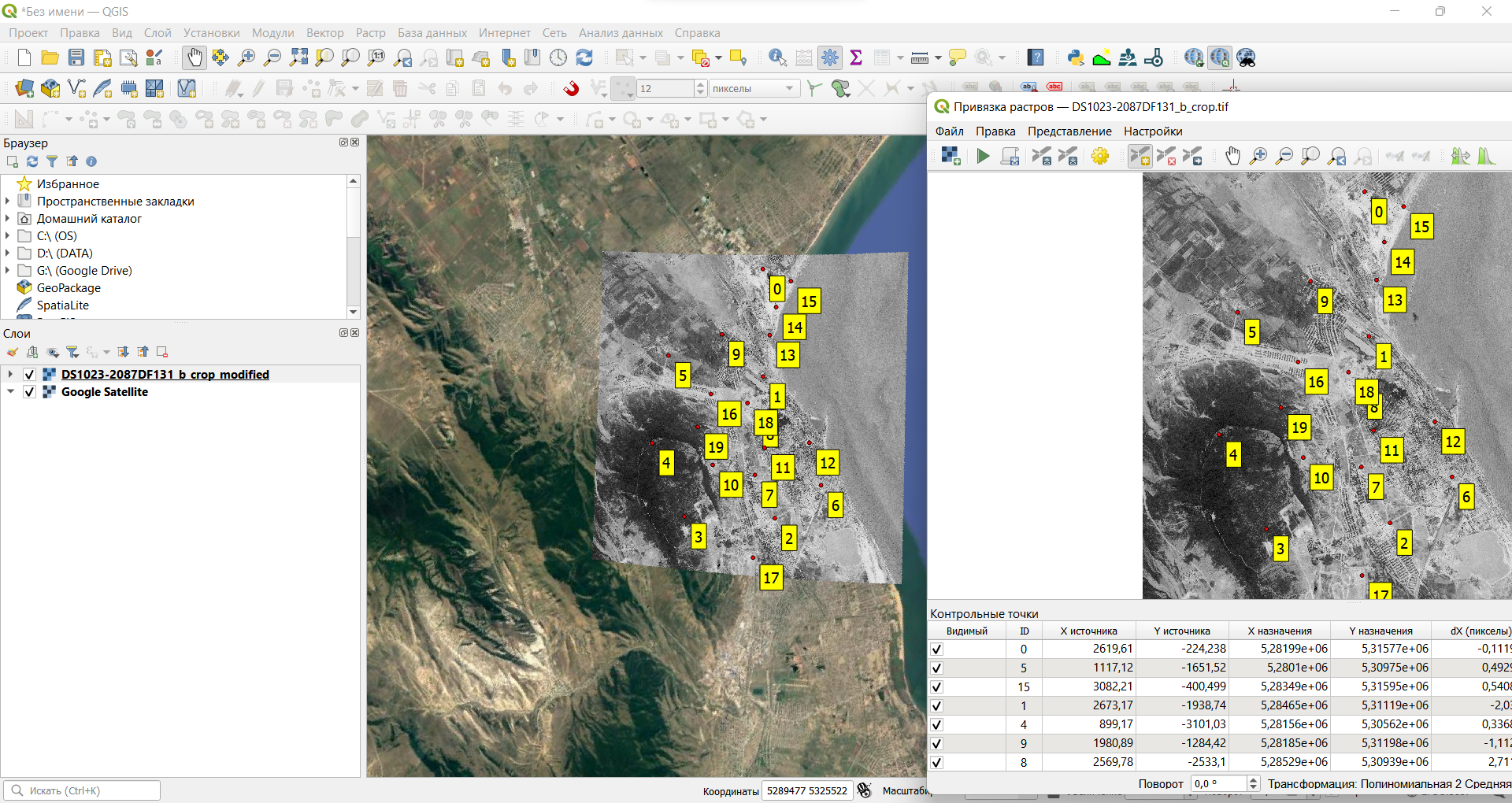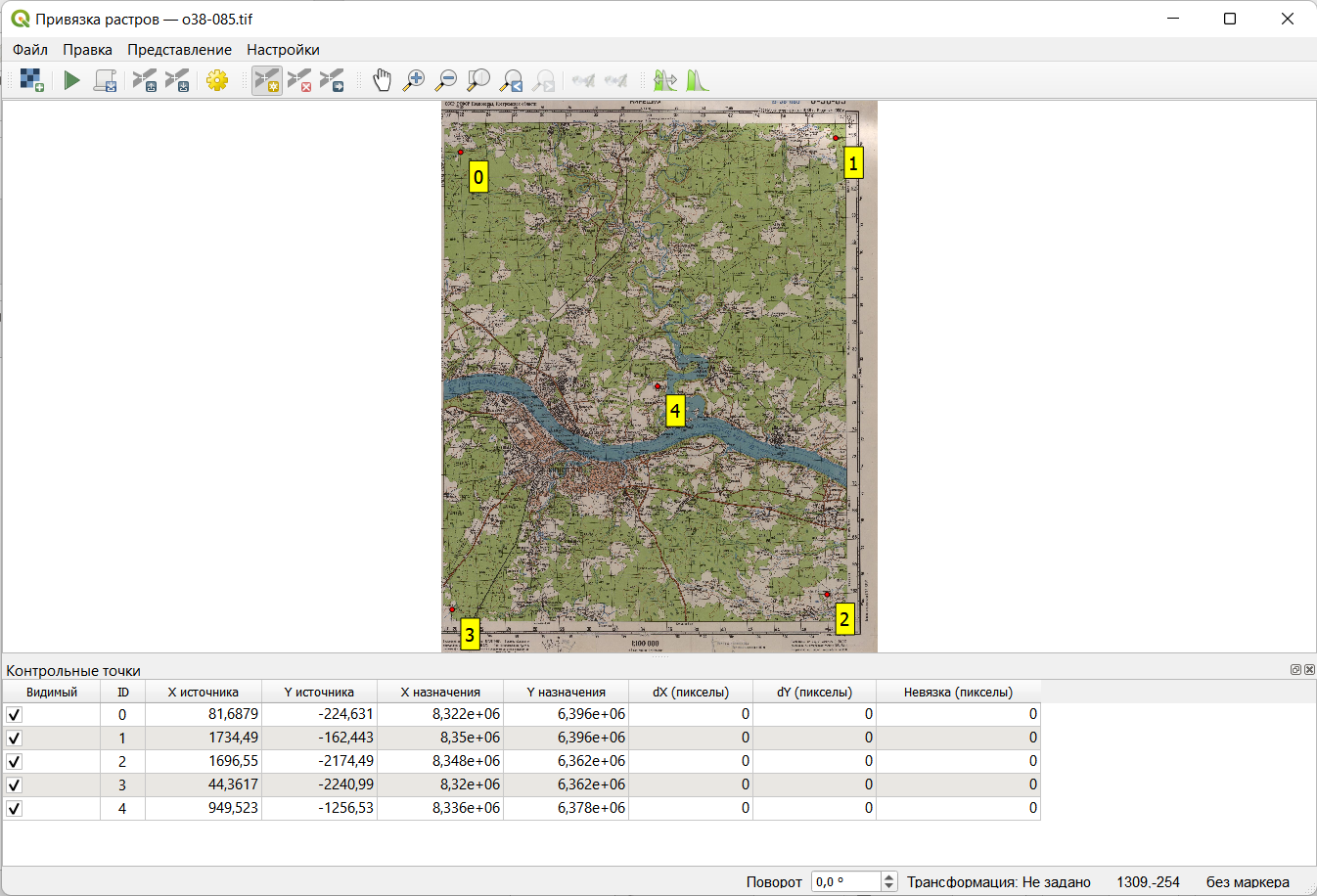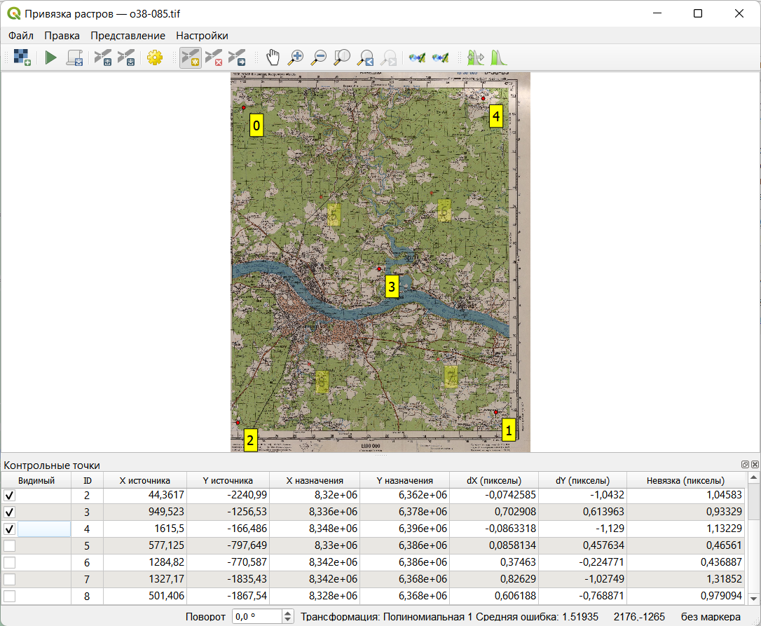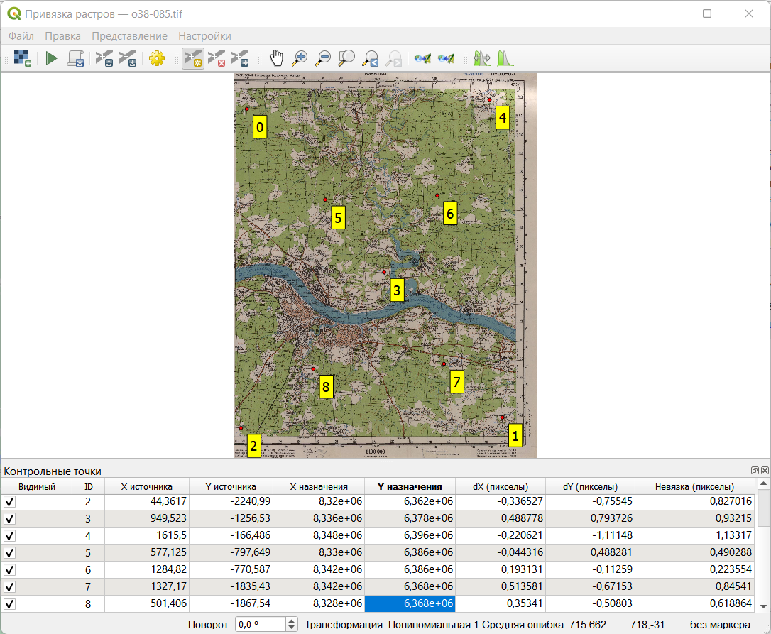Изучите информацию, которая отображается в таблице внизу. «X источника» и «Y источника» — это координаты точек привязки на исходном растре, измеренные в пикселях растра от левого верхнего угла. «X назначения» и «Y назначения» — координаты на местности. В столбцах «dX», «dY» и «Невязка» будут отображаться несхождения в определении координат. Сейчас там отображаются нули, поскольку мы не задали настройки трансформации.