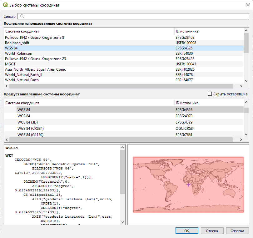 Нам необходимо выбрать целевую систему координат. Мы помним, что топографические карты составляются в проекции Гаусса-Крюгера, однако для задания системы координат этого недостаточно. Система координат состоит из двух основных элементов: геодезической основы и параметров проектирования. В геодезическую основу входят параметры вспомогательной поверхности, аппроксимирующей земной шар (для эллипсоида: большая полуось и эксцентриситет), а также ряд параметров, определяющих положение этой фигуры в теле Земли. В параметры проектирования входит вид проекции (например, равноугольная поперечно-цилиндрическая) и конкретные параметры проектирования (например, средний меридиан или широта начала отсчёта долгот).
