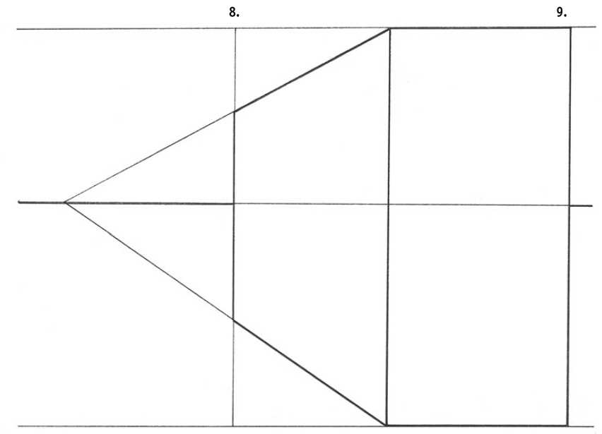 Затем нарисуйте две вертикальные линии, параллельные первой вертикали (одну справа (9) и одну слева (8)), которые будут пересекать две линии, идущие к точке схода.