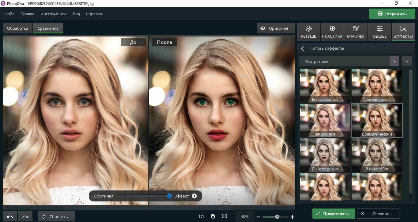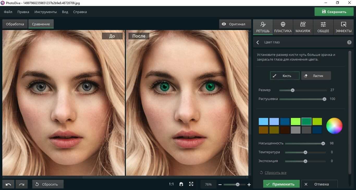 Готово – вы изменили цвет глаз на фото! Теперь можно сохранить снимок или продолжить редактирование. PhotoDiva позволяет изменять буквально любой аспект портрета. Добавляйте привлекательный макияж, накладывайте интересные фильтры, применяйте пластику или проводите супер-ретушь. Если же вы хотите удалить с лица прыщи и другие мелкие дефекты, подробную инструкцию можно найти в статье «Простая ретушь: убираем прыщи на фото».