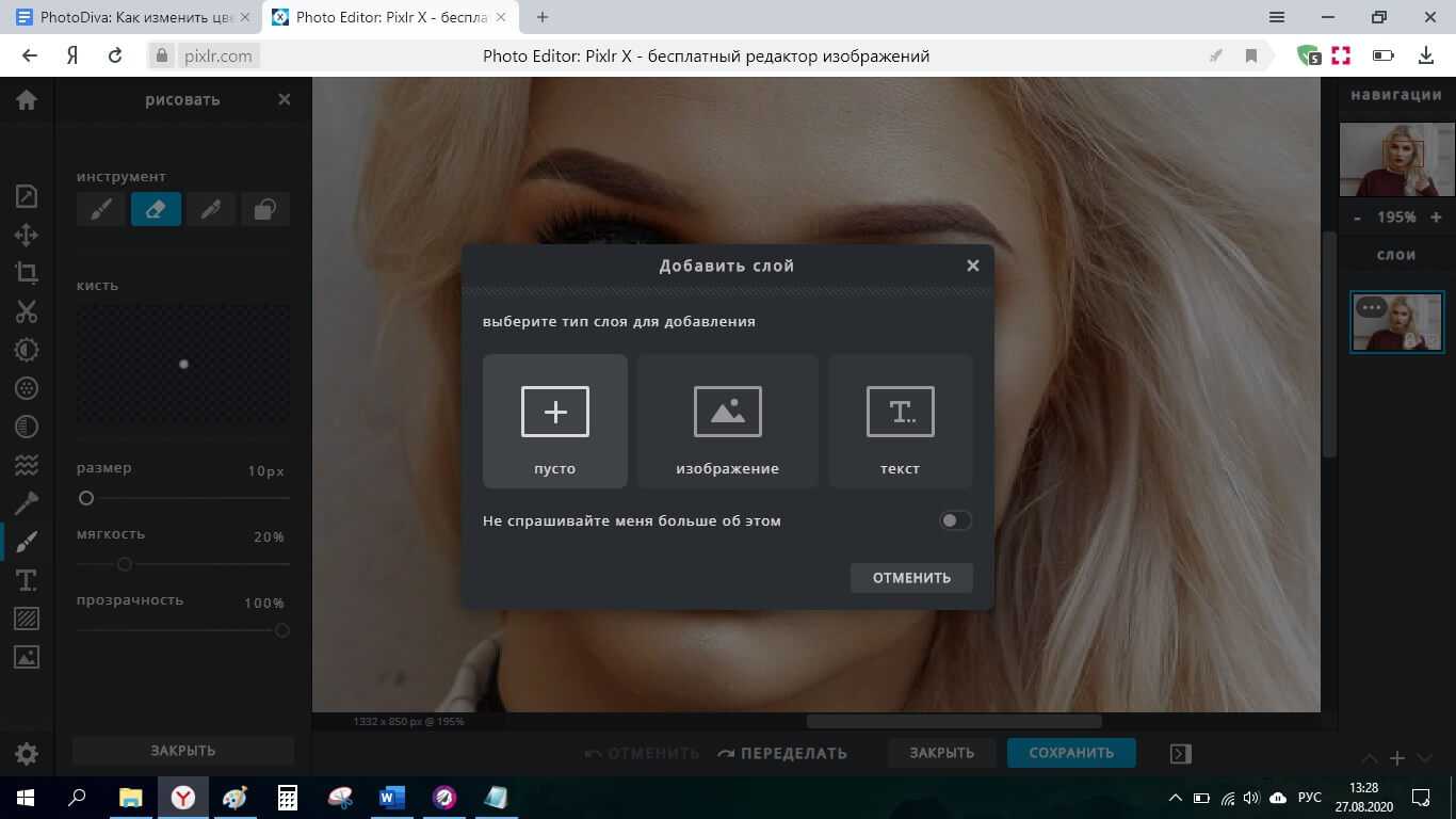 PIXLR — полноценный графический редактор, функционирующий в режиме онлайн. В нем нет отдельного инструмента отвечающего за изменение цвета глаз на фото, но вместо него можно использовать другие опции, связанные с настройкой цвета, о чем вы и узнаете в этой инструкции.