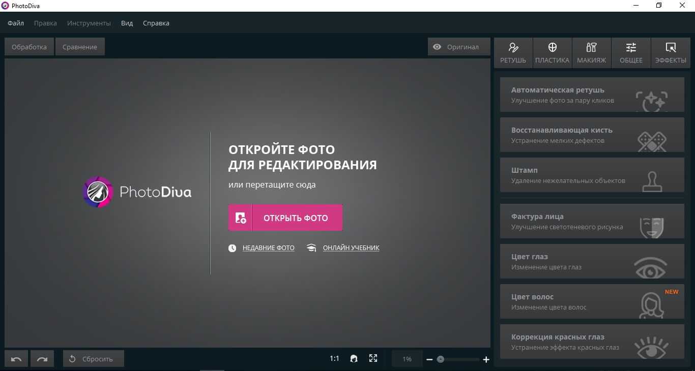 Редактор PhotoDiva разработан специально для того, чтобы создавать эффектные портретные фото. В нем легко убрать мешки под глазами, нанести привлекательный макияж, удалить косметические дефекты на лице и многое другое. Если вы не обладаете навыками ретуши, в программе доступна развёрнутая помощь в виде наглядных уроков и видеоинструкций.