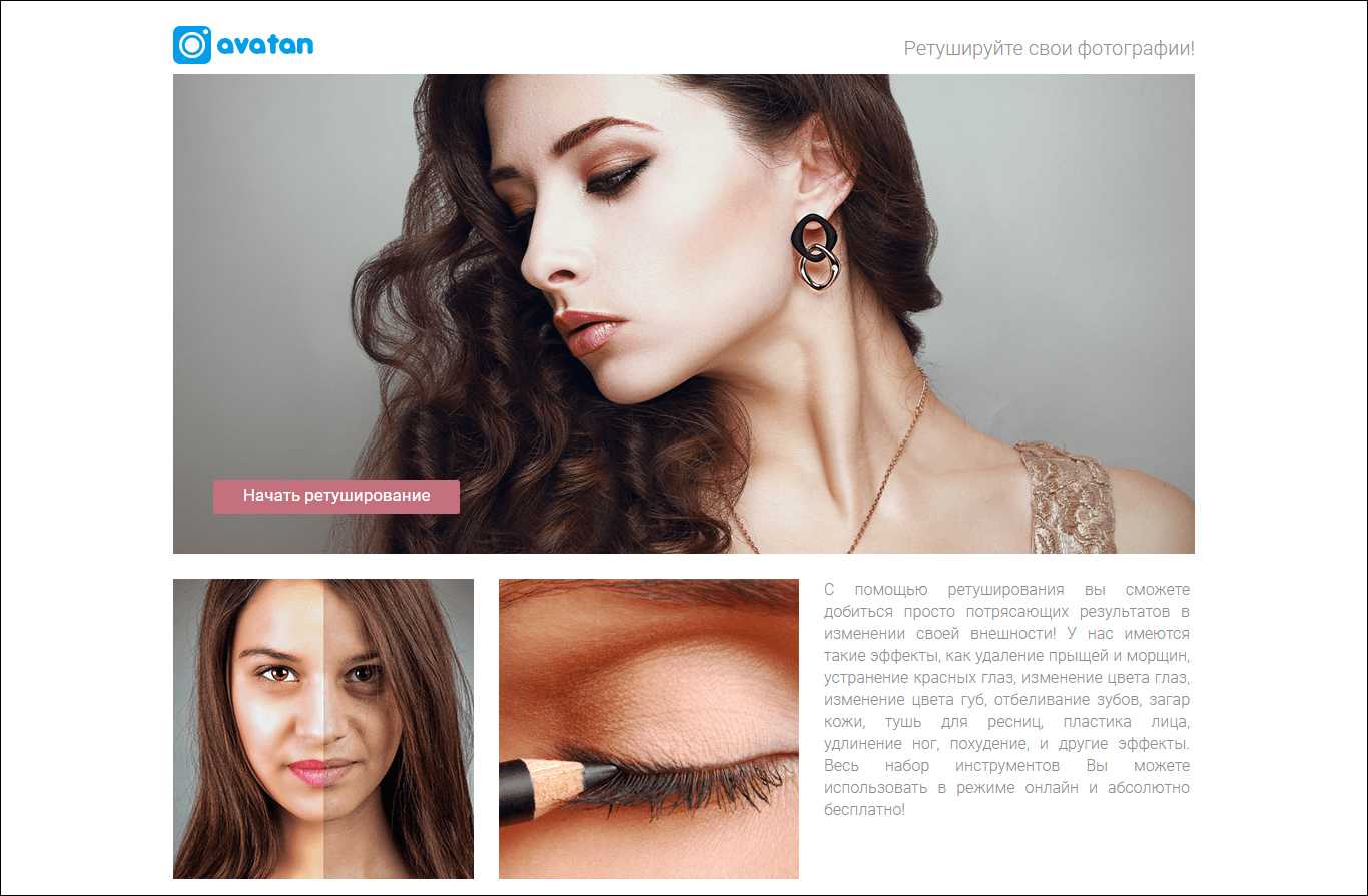 Проект Avantan https://avatan.ru/ – универсальное средство. Здесь доступны все базовые инструменты: обрезка, поворот, изменение экспозиции, резкости, цветов. Есть неплохие наборы фильтров и эффектов для преображения кадра. Инструмент «Ретушь» предназначен для улучшения и изменения внешнего вида. Все действия вы проводите вручную, с возможностью гибкой корректировки параметров.