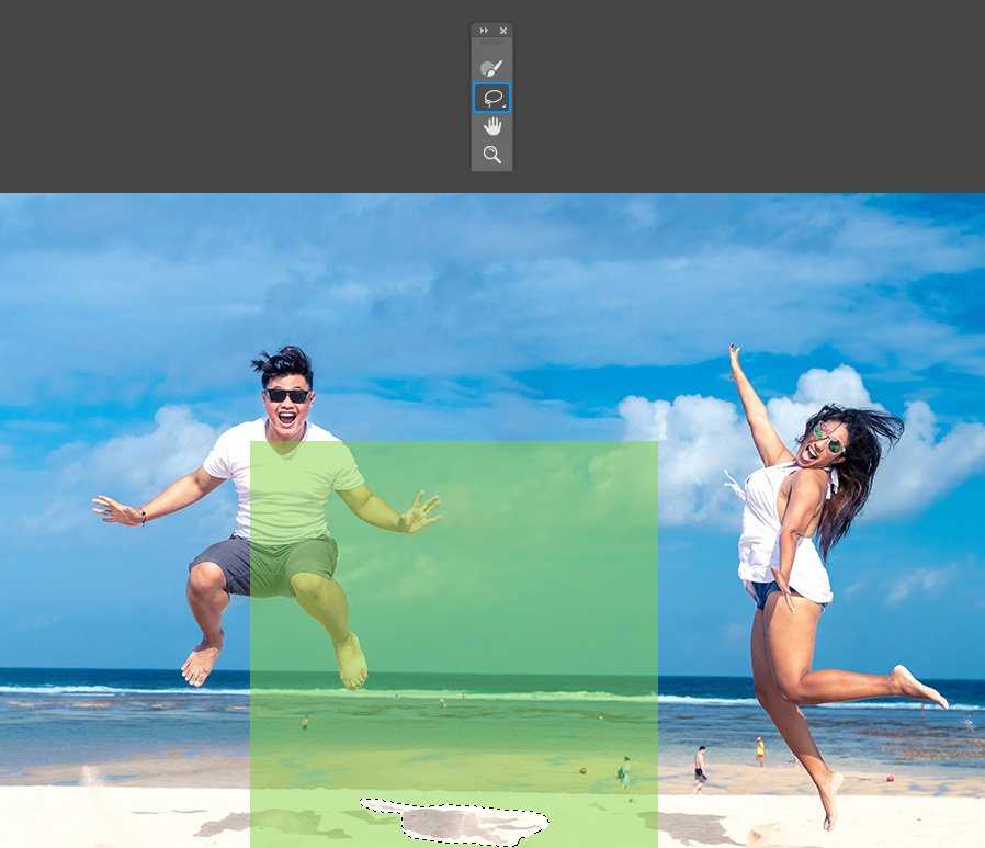 Поскольку выделение, которое мы сделали, немного меньше, чем то, что нужно, настроим его с помощью инструмента Lasso Tool (Лассо) внутри панели настройки инструмента Заливка с учетом содержимого. Выберите инструмент Lasso Tool (Лассо) и закрасьте выделение вокруг тех областей тени, которые мы пропустили.