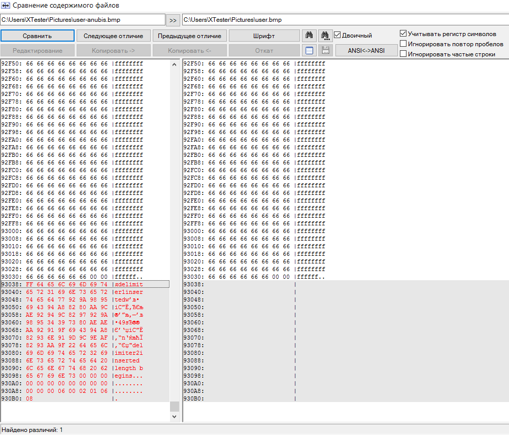 Побайтное сравнение тоже дает очень характерную картину. Несмотря на малый размер скрываемого файла, в контейнере изменены значения у большинства пикселей. Если jHide хватило 330 байт для записи стегосообщения, то OpenPuff использовал для этой же задачи более 170 Кбайт.
