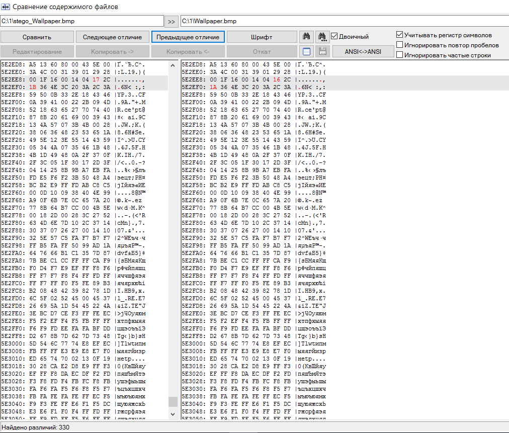 Сравнение в hex-кодах показывает все тот же алгоритм LSB, однако его реализация здесь более удачная. Измененные пиксели не группируются крупными блоками от начала файла, а равномерно рассеяны по всему контейнеру. Так гораздо сложнее обнаружить скрытое сообщение в картинке. При малом размере стегосообщения это практически невозможно сделать, не имея для сравнения оригинал (пустой контейнер).