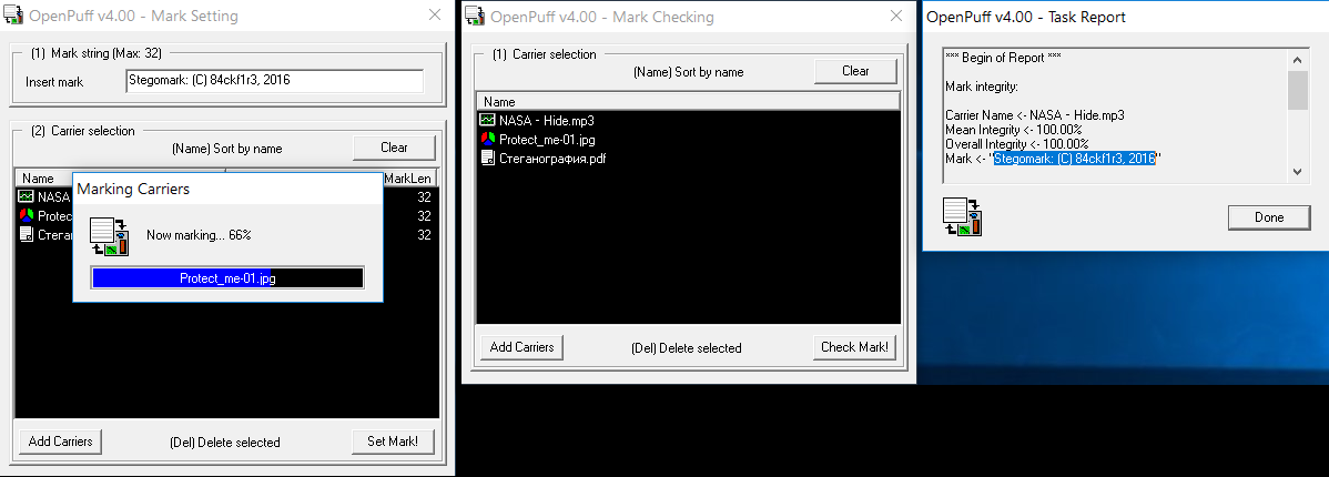 Другой режим работы программы — запись и чтение стегометок. Это скрытые строки длиной до 32 символов, которые можно использовать для защиты авторского права. Например, спрятать копирайт в фотографии, музыкальном файле или документе.