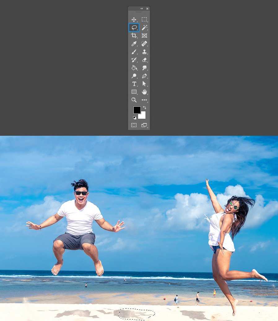 Чтобы заменить тень, мы будем следовать той же процедуре. Сначала сделайте выделение тени, используя инструмент Lasso Tool (Лассо) или любой другой, которым вам удобно работать.