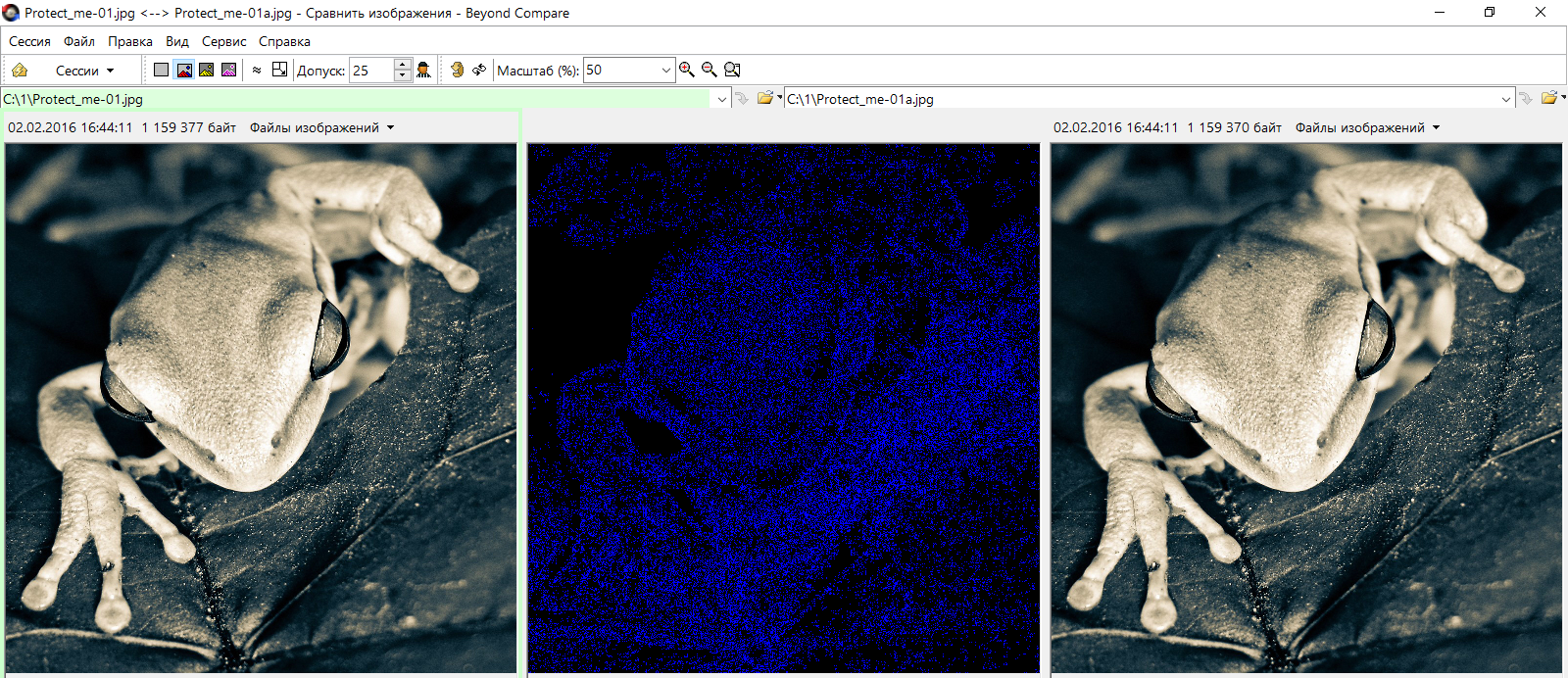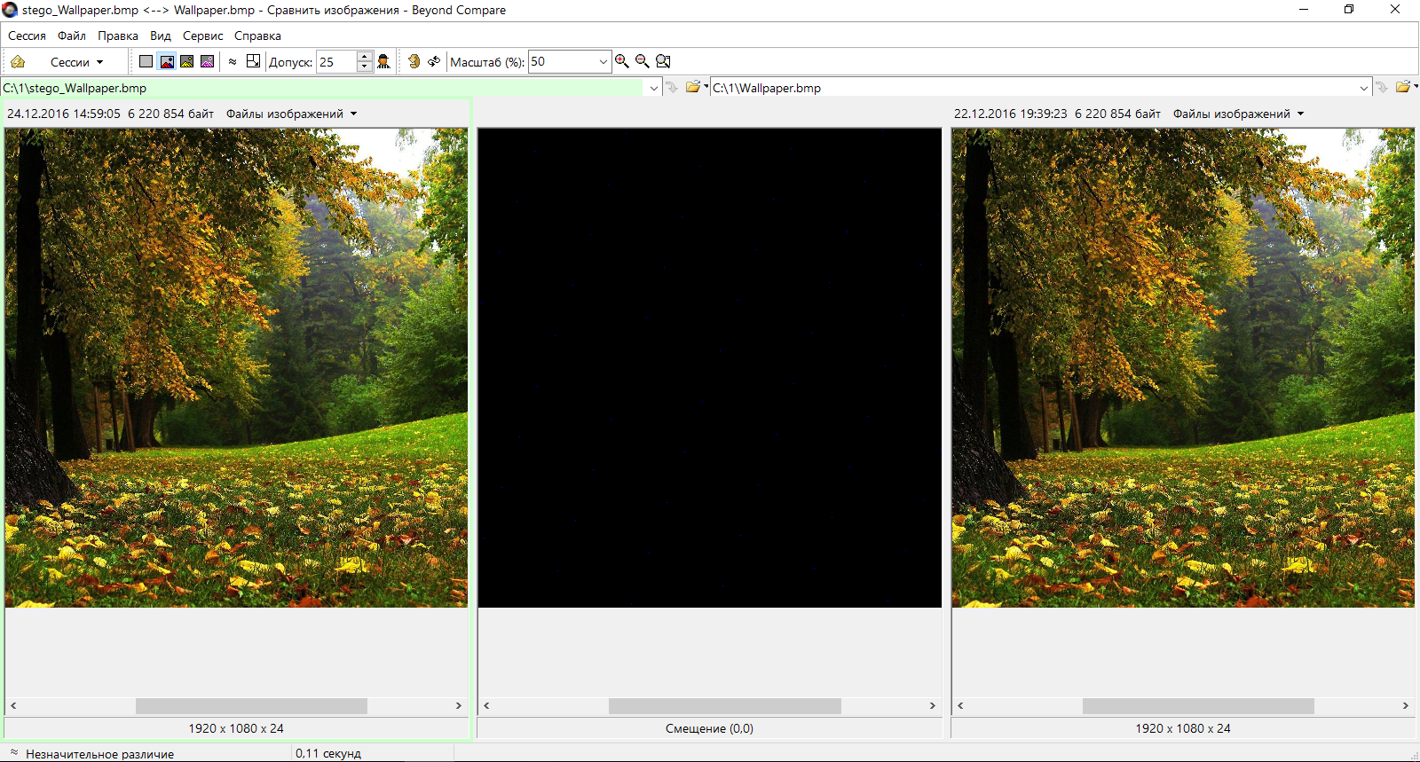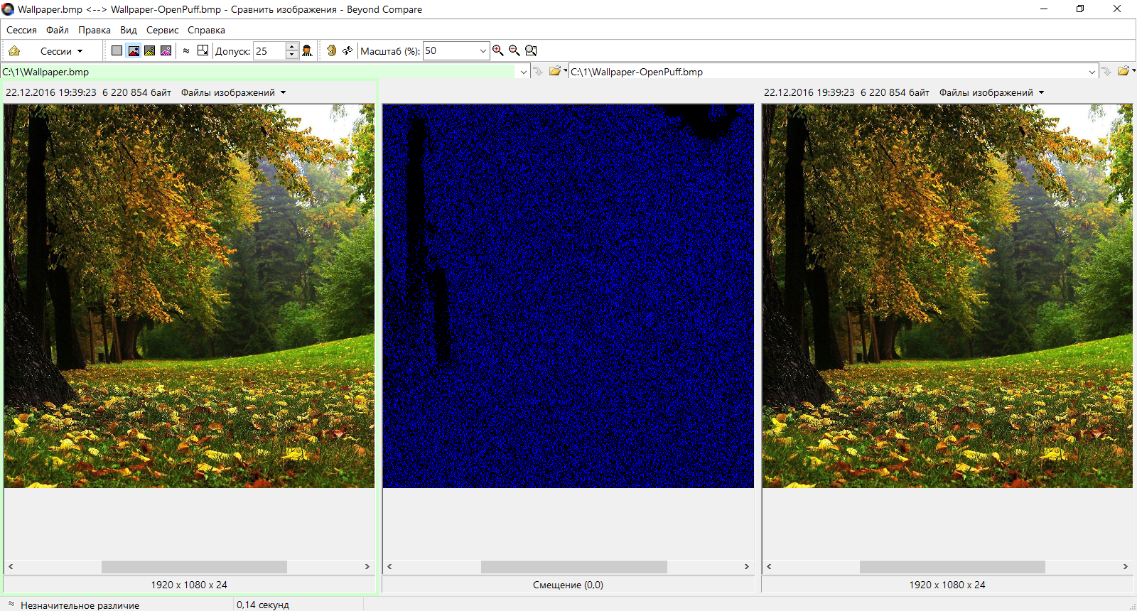 Сравнение утилитой Beyond Compare показывает едва различимые отличия. В первую секунду их не видно вообще. Надо прибавить яркости и присмотреться, чтобы разглядеть на черном фоне равномерно рассеянные темно-синие точки.