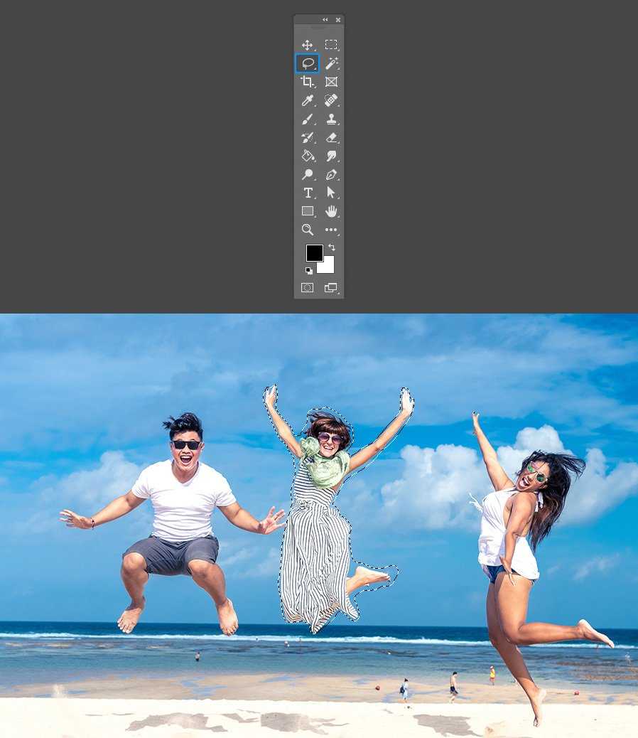 Выберите инструмент Lasso Tool (Лассо) (L) и выделите девушку посередине. Не беспокойтесь о точности, потому что мы можем все отредактировать на панели инструментов Заливки с учетом содержимого.