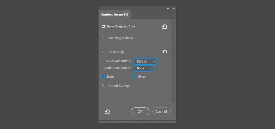 На панели настройки Content-Aware Fill (Заливка с учетом содержимого) раскройте элементы управления Fill Settings (Параметры заливки) и установите для параметра Color Adaptation (Цветовая адаптация) значение Default (По умолчанию), для параметра Rotation Adaptation (Адаптация поворота) — значение None (Нет) и оставьте флажки Scale (Масштаб) и Mirror (Зеркало) неактивными.