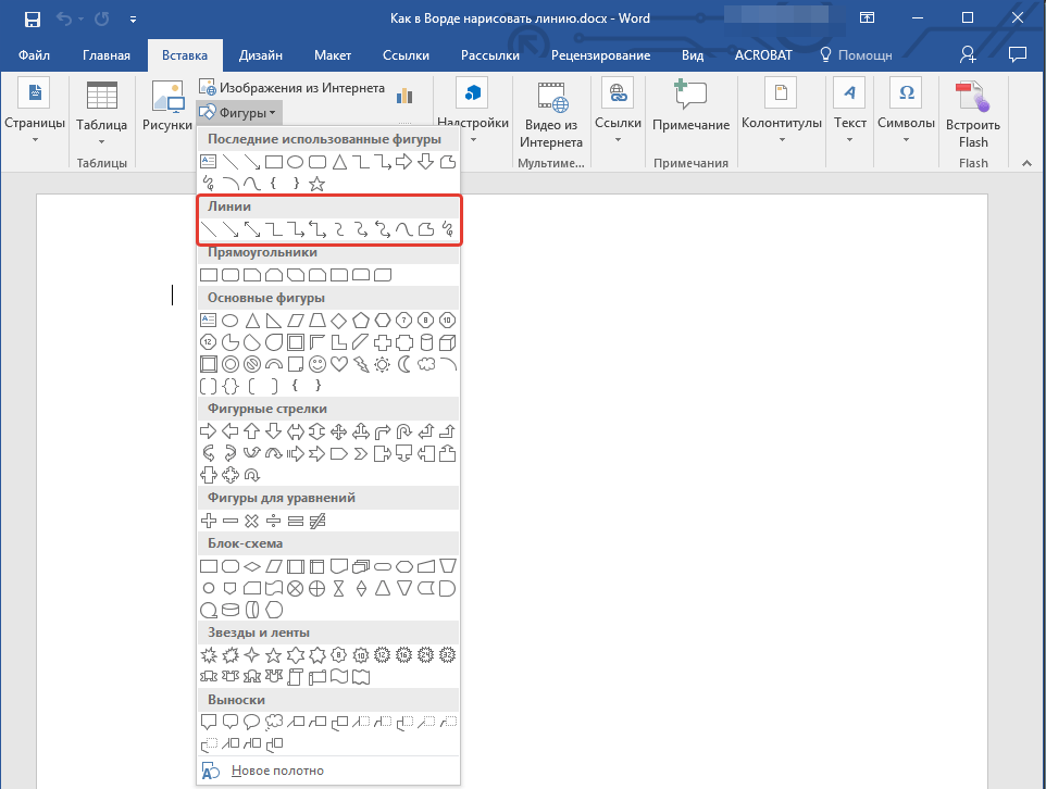 - На вкладке «Вставка» в группе «Иллюстрации» нажмите кнопку «Фигуры.